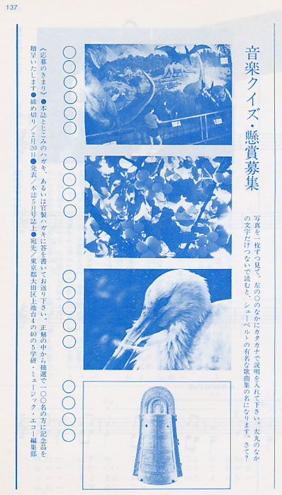★「エコー・オブ・エコーとはあなたの広場です」とのこと。要するに、読者の投稿ページである。募集しているのは「作曲コーナー」「詩人の広場」「ディスカッション広場」「評論コーナー」「なんでも質問箱」。